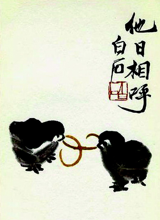 现代的齐白石老画师亦很富于幽默的情感,他有一幅《小鸡争蚯蚓图》,名闻世界,到处都见它在做贺年片用,画两只雏鸡在争夺一条蚯蚓。由于齐老在上面自题“他日相呼”四字,所以亦有人名之曰《他日相呼图》。