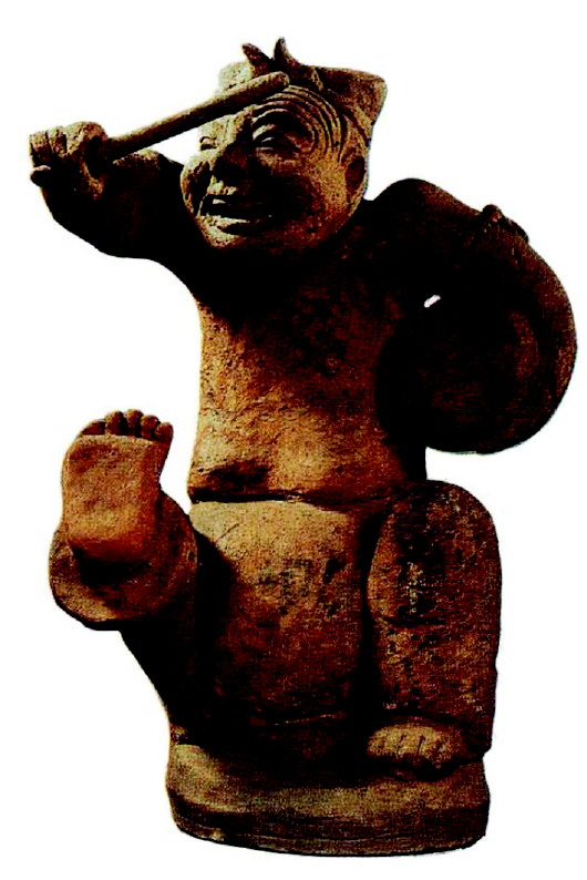 汉代有许多说书人的优伶俑都使人发噱,在这里只举一尊以见例。看这位手舞足蹈的说书人,手执棰鼓,眉开眼笑,正在讲人间最最有趣的故事,试把这位笑倒世间的说书人像移作太史公《滑稽列传》的封面,请看他上翘穹苍的脚板丫子如何得意忘形……