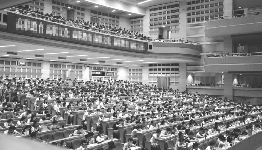 3日,山东会堂3000多人的大礼堂里座无虚席,这些学生正在上考研政治的课程,备战2019年的研究生考试。上课时间为上午8:30--12:00,下午14:00--17:20。由于人数较多,一同翻书的声音就如同哗啦啦的下雨声。