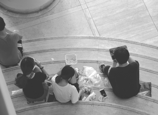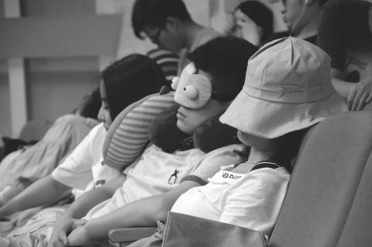 大家按照报名顺序排座,最后报名的学生只能坐在加置的小板凳上。中午时间短暂,大部分学生不会返回住处休息,学生分散到各处,或者叫外卖或者吃自己带的快餐。然后就抓紧补觉,大家在自己的座椅上随便一歪,戴上眼罩,靠着抱枕,就能睡上一小会。