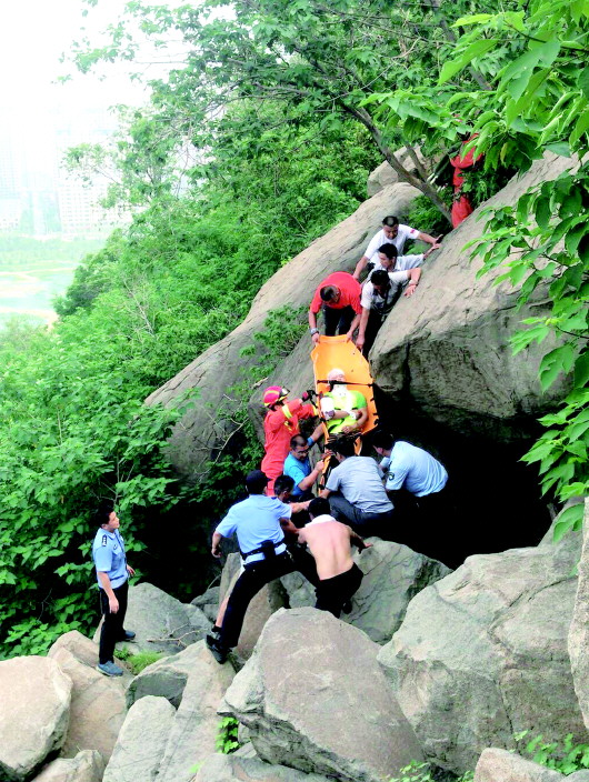 8日上午8时许,济南华山,一名中年男子从华山后山爬山时不慎摔落受伤,情况危急。救援人员赶到现场,将伤者固定在担架上之后,冒着35℃的高温,轮流抬着慢慢下山。由于下山道路崎岖加上天气炎热,原本20分钟的路程,用了一个多小时。 本报记者 杜洪雷 通讯员 王刚 摄影报道