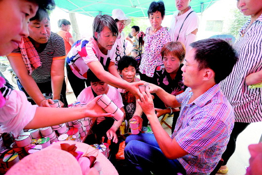 时间过了清晨6点,来卖蟋蟀的人们逐步多了起来,来来往往的村民们以妇女为主,辛劳逮虫的男人大都白天在家休整。她们大都挎着一个篮子,里面放着十几个装着蟋蟀的罐子,他们一家一家问,如同流水线一样围在客商面前。客商们熟练地单手打开盖,有的一眼就过,拿不准地用打牙芡草挑逗一下。大半天下来,出手的客商并不多,一个小时下来,多数客商脚下的篮子里还是空空如也。