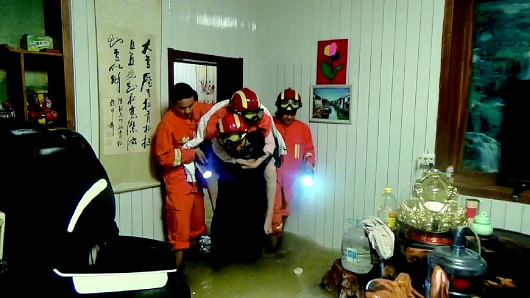 ▲19日晚7时许,因雨水灌入家中,槐荫区吴家堡郑家店村一位半瘫老人被困,急需救援。济南市公安消防支队美里湖中队消防人员赶到现场后,背着老人转移至高处房间。 本报记者 尉伟 通讯员 张剑 摄
