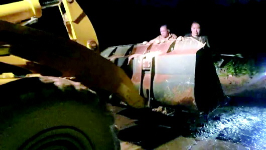 ▲19日下午5时37分,历城区虞山花园小区内一处4米高的土堆塌方,临近楼层的四名群众被困地下室。济南市公安消防支队济钢中队消防人员到达现场后,利用铲车将被困人员成功救出。 本报记者 尉伟 通讯员 荆彦瑞 摄