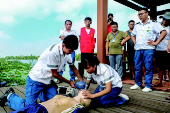 近日,微山县旅游局、县人民医院在微山湖湿地景区内联合开展了防溺亡应急抢救演练。通过防溺亡情景应急抢救演练,对景区工作人员、游客进行了心肺复苏现场培训,检验景区及医院防溺亡应急预案的实用性和科学性,同时普及防溺水、溺亡的知识,提高了处置应急突发事故的能力。