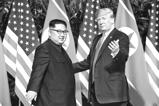 6月12日,朝鲜最高领导人金正恩(左)与美国总统特朗普在新加坡举行会晤。 (资料片)