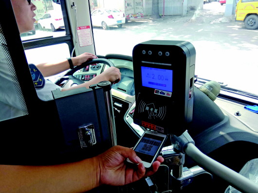 乘客在使用京东支付乘坐公交车。 本报记者 刘飞跃 摄