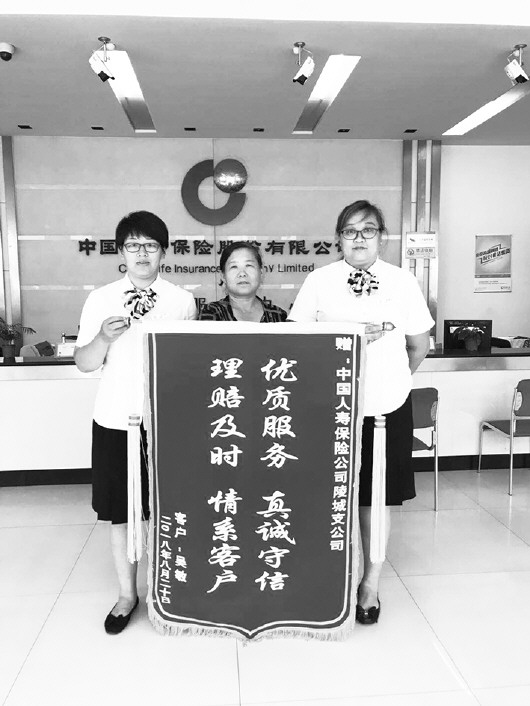 2018年8月20日,家住陵城区的吴某专程来到中国人寿陵城区支公司致谢,并给公司送来一面写有“优质服务 真诚守信 理赔及时 情系客户”的锦旗。