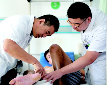 王新(左)检查伤者的病情。