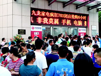 7月3日,太白楼路九龙家电门前,市民等待进场。 本报记者 李岩松 摄
