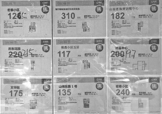 4日,在济南和平路一家房产中介,橱窗内的二手房价格有的被调低。 本报记者 魏新丽 摄