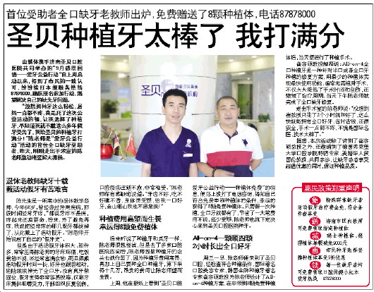 上周,他在报纸上看到“圣贝口腔爱牙公益行动——种植体免费”的消息,便马上拨打了电话咨询,得知自己符合免费申领种植体的条件,幸运的获得了8颗免费种植体。只需要一次种植,全口牙就都有了,节省了一大笔费用不说,还少受罪,陈老师也就下定决心来到圣贝口腔医院种牙。