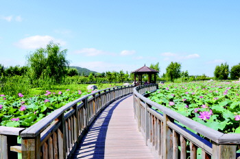 走进羊亭公园,可以看到灯塔矗立在不远处,一旁有景观山、文化广场等文体活动场地。跟随着行人的脚步向南走去,一池荷花映入眼帘。荷花池很大,荷花池上修了木桥和小亭子,游客可以站在桥上,坐在亭子里观赏荷花的容貌。说起来,小桥的设计也很有特点。俯瞰整个荷花池,可以看到小桥整个是一颗心的形状,围起了整片荷塘。一眼望去,层层叠叠的荷叶青翠碧绿,粉红色荷花有的含苞待放,有的绽蕾盛开,在阳光辉映下,显得格外的鲜艳娇红。不由想起杨万里的一句诗“接天莲叶无穷碧,映日荷花别样红。”