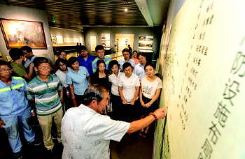 8月31日,皇冠街道富港社区、海泉社区近百名社区居民参观威海市博物馆,从历史老照片中探寻沟北村的变迁。图为富港社区居民鲁传孚在《甲午海战威海海防设施布局图》前为居民讲解沟北船坞与子药库的位置。
