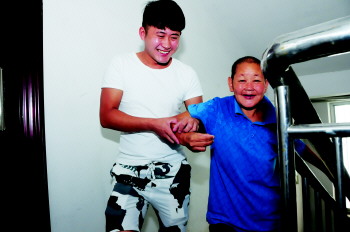 吕素香在儿子的搀扶下回到自己的家中。 本报记者 李洋 摄