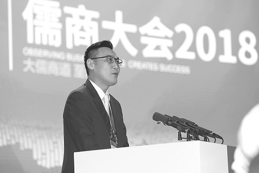 孔子第79代嫡长孙孔垂长阐述儒商之意。 本报记者 王媛 摄