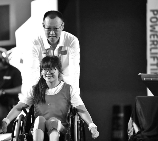 在雅加达举行的第三届亚洲残疾人运动会举重女子41公斤级比赛中,来自山东的选手崔哲以100公斤的成绩夺得冠军,这也是中国代表团在本届亚洲残运会上获得的首枚金牌。图为崔哲与她的教练。