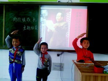 向国旗敬礼 国庆节前夕,沂源县张家坡中心学校小学部举行“向国旗敬礼,做有道德的人”主题班会活动。增强了学生的爱国意识。(王均升)