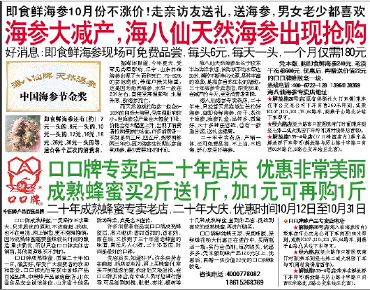 凭本版,购即食鲜海参240元,老淡干海参600元,优惠后,再赠送价值22元的口口牌蜂胶皂一块。