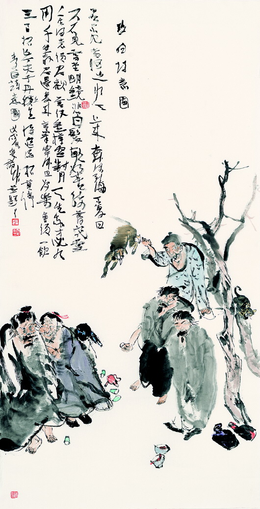 人物画,刻画的是人物,承载的却是文化和历史。在李振坤看来,画人物画是很累的……要想将人画得逼真、形似,并不难。难的是做到“神驰”,更难的是让画本身有文化内涵,有人文关注。这就要求一个画家必须有丰富的生活积累、深厚的文化素养。为做到“神驰”,使画作富于文化内涵,每创作一幅作品,李振坤都要做大量准备工作,因此,其作品构图简洁,飘逸传神,意境深邃,内涵丰富,表现的人物往往厚重而丰富,富于灵性、禅味和“鬼气”,深得传统文化之“三味”。