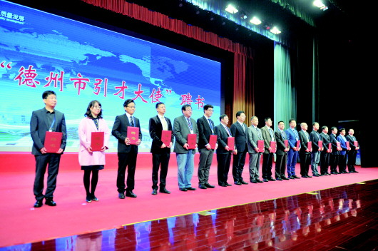 在启动仪式上,德州市委副书记、市长陈飞向17名“德州市引才大使”颁发了聘书。今后,“引才大使”们将通过各自资源,热心宣传德州市发展环境和引才政策,帮助德州市提供人才项目信息和牵线搭桥的国内外高层次人才或特色行业协会、人才中介机构、专业社会团体负责人。“今后将发挥环球英才会在中关村的资源优势,积极在中关村推介德州,引导中关村乃至京津的高端人才、高新组织、科技企业等携项目资源前来交流和对接。”德州市引才大使、北京环球英才促进会执行会长、环球英才网董事长丁志峰称,发挥环球英才网的独特优势,打通德州与全球才智资源匹配、对接的关口,将对德州较有意向、符合德州产业发展需求的才智资源遴选进来。