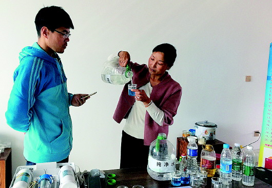 任老还告诉记者一个生活小妙招。“小分子团水还有解酒功效,饮酒后喝5杯以上,即可解除醉酒状态。”工作人员在烧杯中倒入少量小分子团水,滴入PH试剂后水呈蓝色,再倒入适量白酒,液体变为黄色,此时呈酸性。随后,烧杯中被再次倒入部分小分子团水,杯中液体慢慢变回蓝色,PH测定值显示为7.8。“说明酒精被中和了,小分子团水可以解酒。”任老说,饮用小分子团水最大的好处就是排酸、排毒、排油,这三步做好了,身体就不会得大的病症。