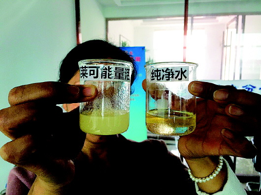为一探究竟,24日上午,记者来到单县任兰才的公司。在检测室内,工作人员现场做了几个小实验。工作人员首先将PH试剂分别滴入装有普通纯净水和小分子团水的烧杯,滴入后纯净水呈黄绿色,而小分子团水呈蓝色,PH测定值显示为7.8,正是适合人体饮用的弱碱性水。工作人员随后在两个烧杯内分别加入20毫升食用油,振荡后可看到小分子团水杯中的油脂已乳化溶解于水,而纯净水杯中仍是油水分离。“这说明小分子团水有溶油功效,可加快人体新陈代谢。”任老解释说。