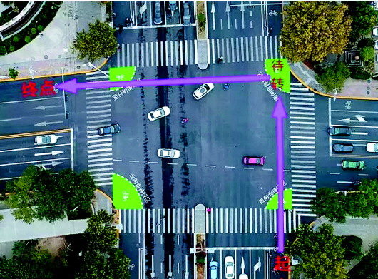 2.非机动车左转需二次过街。非机动车需要左转通过路口时,应按照逆时针方向二次过街。即首先按照顺向非机动车信号灯指示前行至前方待行区,再按照垂直方向非机动车信号灯指示通过路口。红灯时,需在待行区域内等候通行,绿灯时,快速通行。
