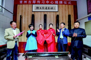 演出结束后,鞠萍一行到学院北校区衡王府清英斫琴坊,参观了非物质文化遗产古琴斫制基地,对学院非物质文化遗产的保护与传承工作给予高度赞扬。鞠萍与陈同洲共同为青州市古琴传习中心揭牌并欣赏了学院教师的古琴演奏。