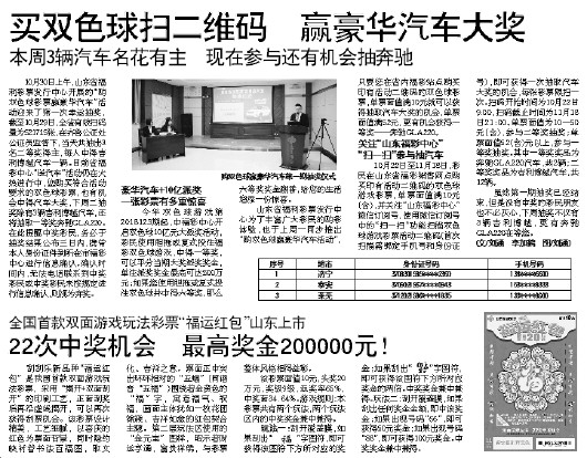 山东省福利彩票发行中心为了丰富广大彩民的购彩体验,也于上周一同步推出“购双色球赢豪华汽车活动”,只要您在省内福彩站点购买印有活动二维码的双色球彩票,单票面值满10元就可以获得抽取汽车大奖的机会,单票面值满52元,更有机会获得一等奖——奔驰GLA220。