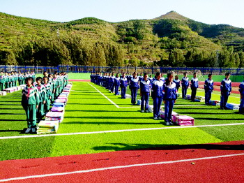 沂源县三岔中心学校全体同学齐聚操场进行叠被子比赛。 (亓和田)