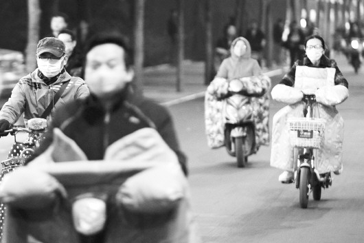 2日晚间,省城济南空气质量出现轻度污染。受气温及空气质量影响,不少市民出行佩戴了口罩。 本报记者 戴伟 摄