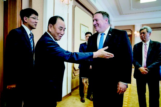 今年7月,蓬佩奥与金英哲(左)在平壤会谈。