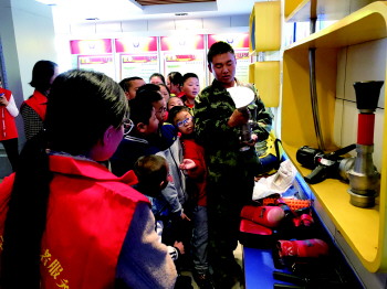 消防员为孩子们讲解各种工具。