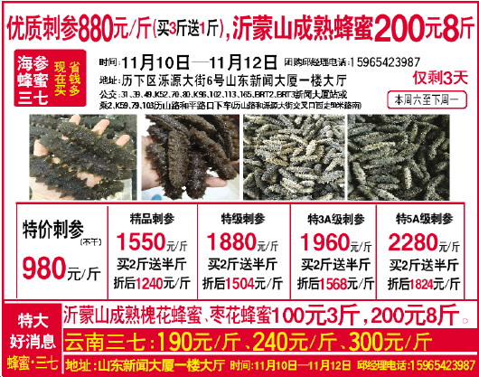 优质刺参880元/斤(买3斤送1斤),沂蒙山成熟蜂蜜200元8斤