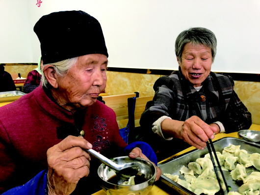 ▲87岁的赵佃娥(图左)正在孝善食堂吃水饺。