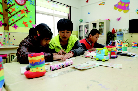 ▲青岛市儿童福利院蓝天之家的护理员在给孩子们上课。