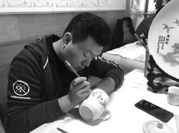 张晓在杯子上作画。