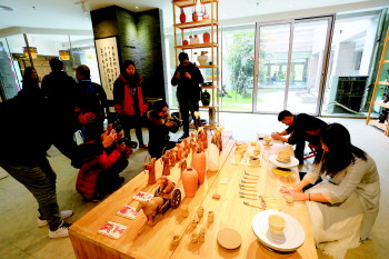 而在墨艺书香展区,来自曲阜的孔子后人向众人展示着书法艺术,宣纸上的挥毫泼墨令大家也有些“手痒”,不少人跟随着书法家试写书法,开启了此次传统文化体验之旅的“体验”环节。“在基地里,最重要的就是来访宾客们可以在每个环节,用体验的形式享受传统文化所带来的文化滋养。”基地的一名讲解员说。