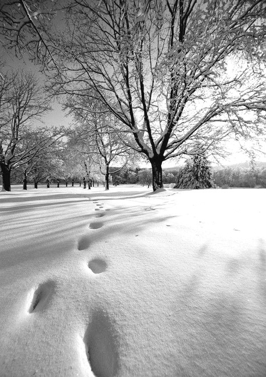 我踩着积雪小心地向前走着,每走一步便发出“咯吱咯吱”的响声。一落脚,便陷进厚厚的雪里;一抬脚,一个深深的脚窝就拓印出来了。走不了多远,回头看看,那一个个脚窝已经被随后落下去的雪掩埋了。此时,我的棉衣上也是白白的了。落在脸上的雪即刻融化了,然后就顺着领子流进了棉袄里头。