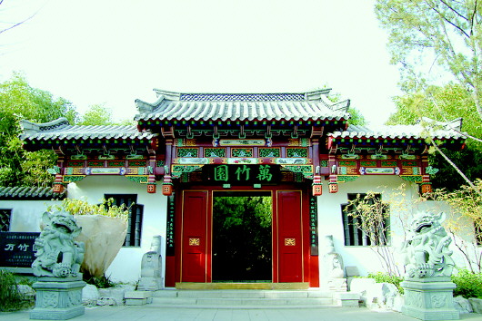 万竹园的建筑朴实雅致,古色古香,厅、堂、馆、榭潜意赋形,数量虽多,却以轻快玲珑为胜。庭院的主要建筑物都规则地排列在一条轴线上。园中的空间一环扣一环,建筑、庭院一层深一层,使人有步步深邃之感。