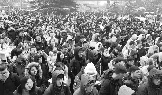 2月15日,众多艺考生快排到济南一中校门外。 本报记者 周青先 摄