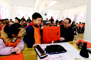 为了充分利用年画作品进行非遗传承教育,让青少年感知优秀传统艺术魅力,开幕式上,特别设计了让小学生参与“潍坊新年画艺术制作体验”的公教活动。本次特邀潍坊8号画馆的学生们50多人,让他们置身其中切身感触传统年画的制作工艺。在展览现场,潍坊著名年画艺术传承人杨志滨老师带领学生们观看了每一幅作品并详细讲解,他还为大家讲述了潍坊杨家埠年画的历史以及潍坊新年画的艺术特征,现场演示并指导学生们伸手一试木版年画《年年有余》的印刷制作,使大家在欣赏年画艺术同时,也切身体验中国古代四大发明之一——雕版印刷术的风采。每个小学生都亲自体验了木版年画的印制过程,孩子们都非常激动与兴奋。