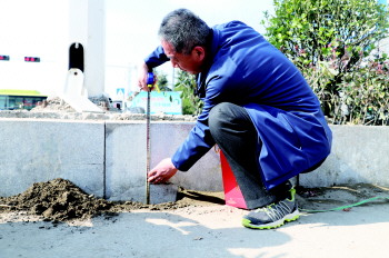 13日下午,随着督导车辆缓缓行驶,327国道应急绿化工程现场成为了绿化工程现场督导会下一个查看点。只见工作人员手持铁锨等工具将靠近辅道的路沿石底部挖开,并用卷尺对其进行高度测量。“50公分。”工作人员随即播报着测量结果。顺着工作人员手指的位置,不难看到部分路沿石底部与地面还存有一定空隙,甚至悬空。