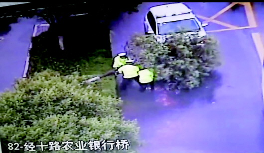 12日17时许,济南历下交警大队指挥中心视频巡逻发现,经十路燕山立交桥西口路段绿化带内一棵大树被风刮倒,树冠和树干影响到公交车和相邻的直行车道,影响经十路主线车道通行。于是,指挥中心调度巡逻警力赶到现场处置。三中队三名交警立即驱车到达现场,三人冒雨合力将大树搬移主路,主干线交通最终恢复畅通。