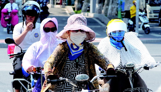 2日,济南街头犹如一个大烤箱,灼热逼人,市民出行也全副武装起来。 齐鲁晚报·齐鲁壹点记者 周青先 摄