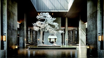 酒店大堂门口的银杏树雕塑为镂空设计,均是由《论语》的文字组成。