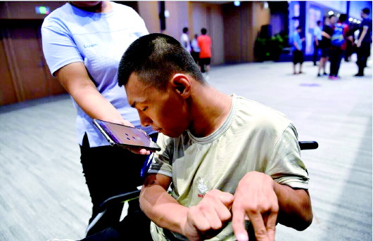 8月19日,2019中国围棋大会在日照开幕。会场内,从吉林省松原市远道而来的彭建明是一位特殊的棋手,在年幼时他不幸罹患脑瘫,平时通过用鼻尖触碰手机的方式在网上与人对弈练习围棋。在妈妈祝长欣的陪同下,彭建明第二次参加中国围棋大赛,对他来说,妈妈就是他的手。