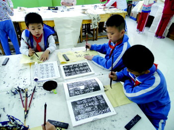 “书香墨韵”书法社团小成员正在练习书法。