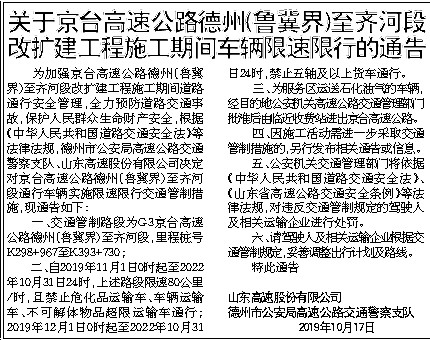 为加强京台高速公路德州(鲁冀界)至齐河段改扩建工程施工期间道路通行安全管理,全力预防道路交通事故,保护人民群众生命财产安全,根据《中华人民共和国道路交通安全法》等法律法规,德州市公安局高速公路交通警察支队、山东高速股份有限公司决定对京台高速公路德州(鲁冀界)至齐河段通行车辆实施限速限行交通管制措施,现通告如下: